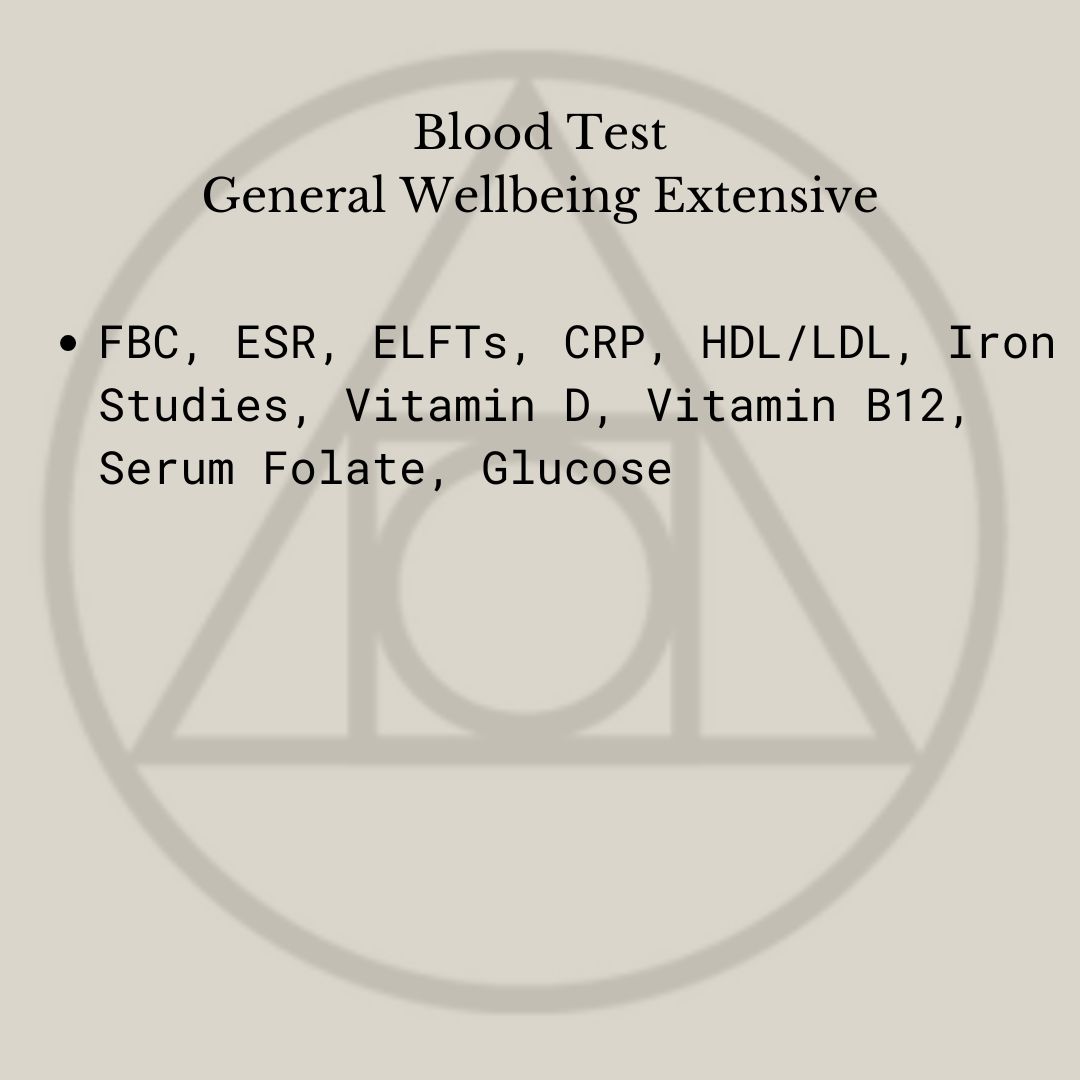 Includes: FBC, ESR, ELFTs, CRP, HDL/LDL, Iron Studies, Vitamin D, Vitamin B12, Serum Folate, Glucose