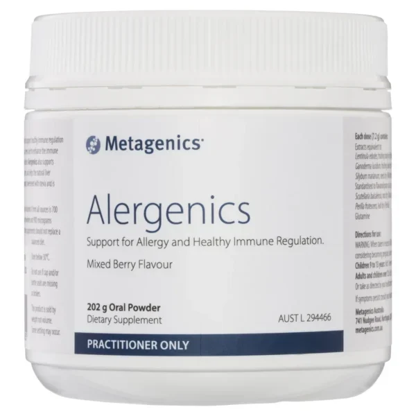 - Metagenics Alergenics has been formulated to support healthy immune regulation and allergy symptoms.