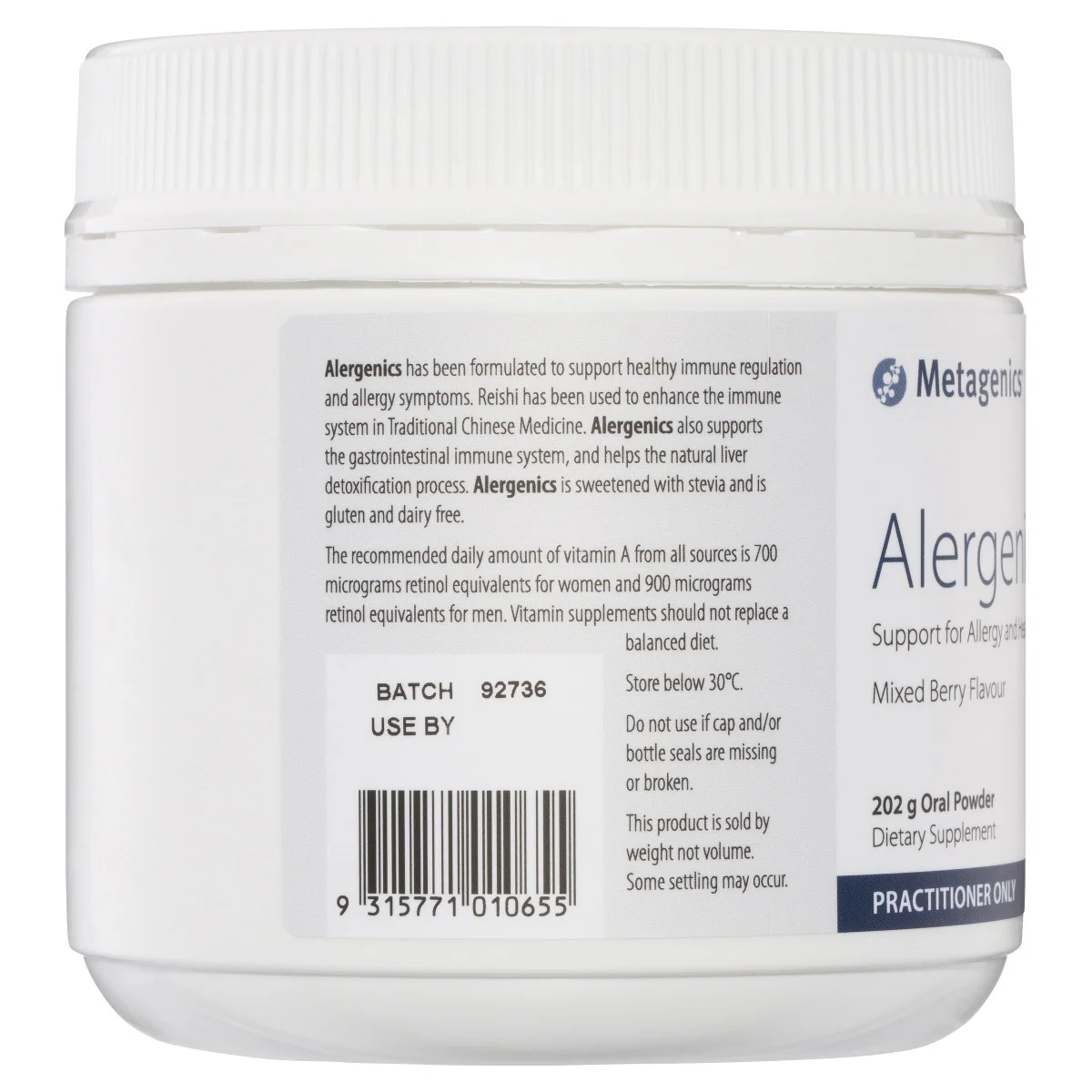 Metagenics Alergenics is free from animal products, corn, dairy protein, lactose, eggs, gluten, wheat, nuts, yeast, soy protein and starches.