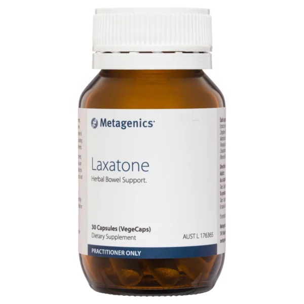 Metagenics Laxatone 30 capsules. Herbal Bowel Support. Take 2 capsules twice daily. Start with 1 capsule at night and increase to maximum dose until daily bowel motion and adjust dose as required.