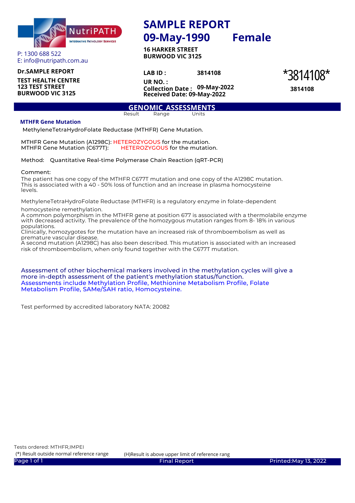 Patients who have homozygous are predisposed to developing high blood levels of homocysteine, particularly when their diets are low in folate. A second mutation in the MTHFR gene, called A1298C, has also been implicated in high blood levels of homocysteine when found in conjunction with the C677T mutation. The MTHFR gene test at NutriPATH can be measured by blood, blood spot or a buccal swab